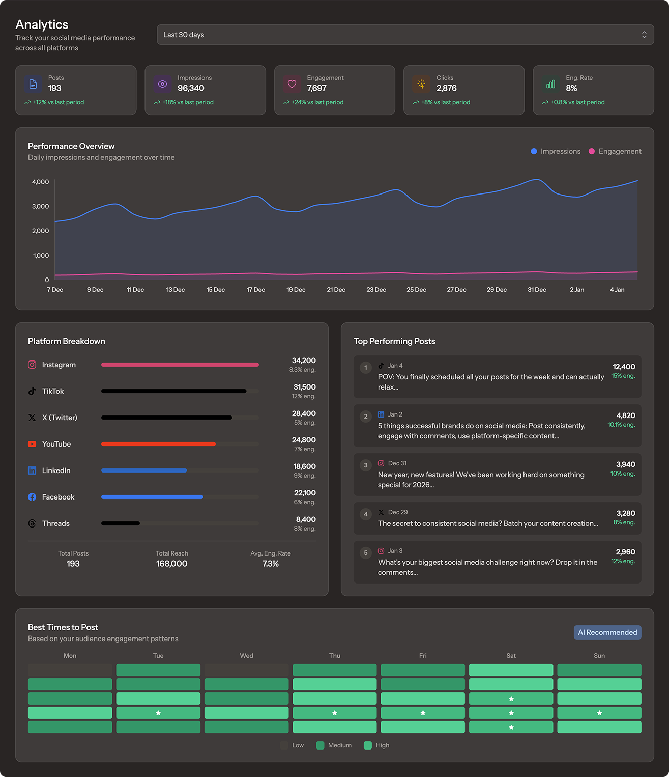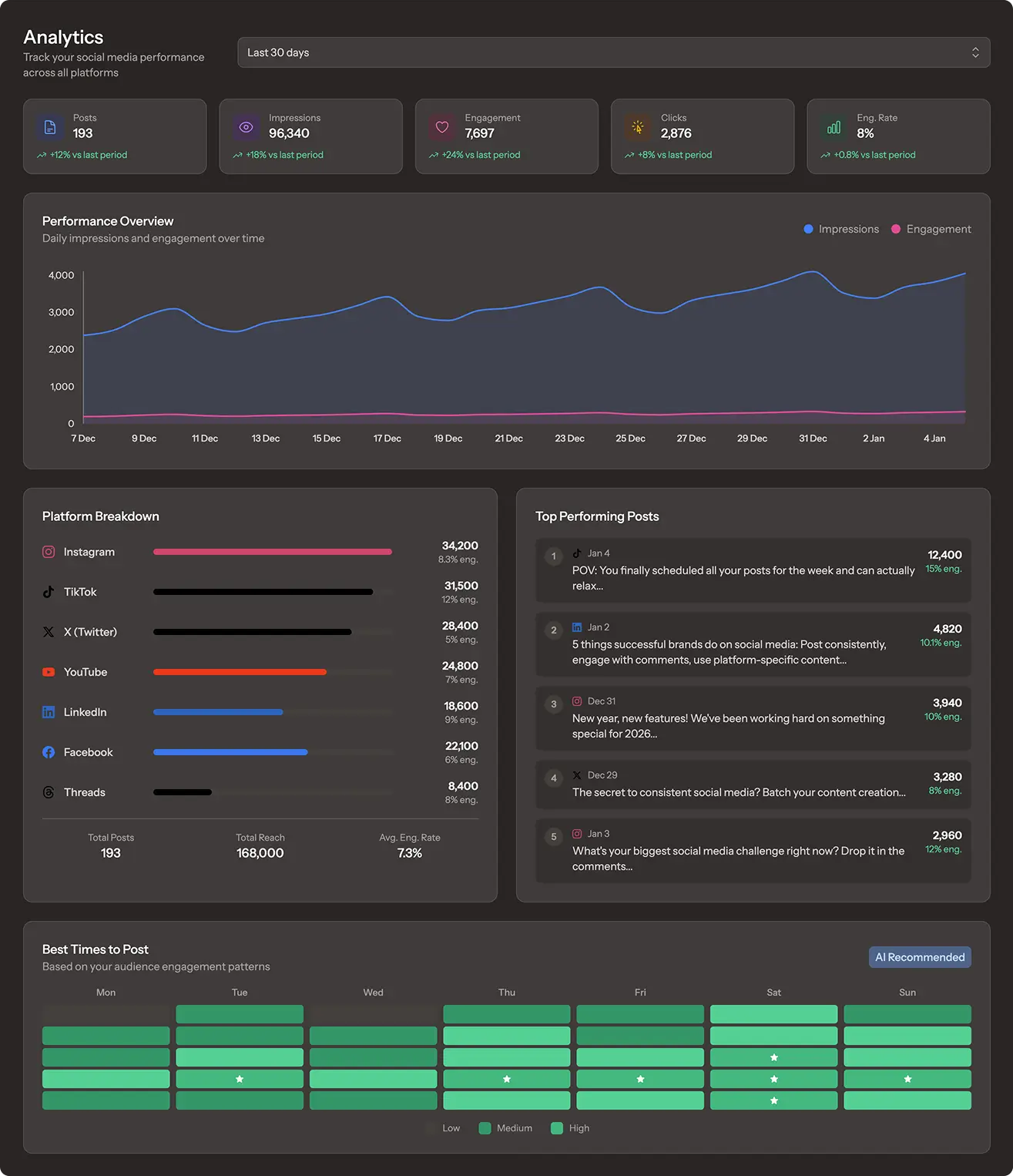 Track your performance without spreadsheets. See engagement, reach, and follower growth across all platforms in one clean dashboard.