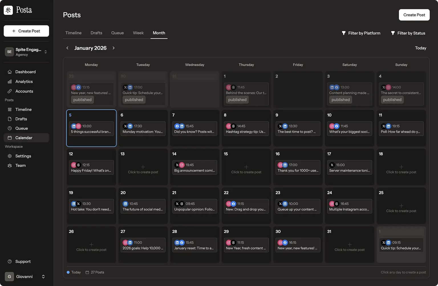 Stop juggling multiple tabs and apps. Posta gives you a single dashboard to plan, create, and publish across all your social accounts.