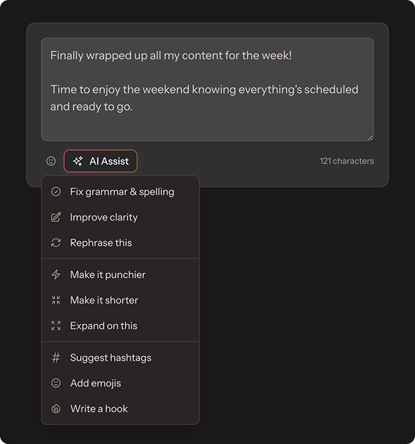 Our AI assistant helps you create engaging content in seconds. Generate fresh captions, improve existing text, or get hashtag suggestions.