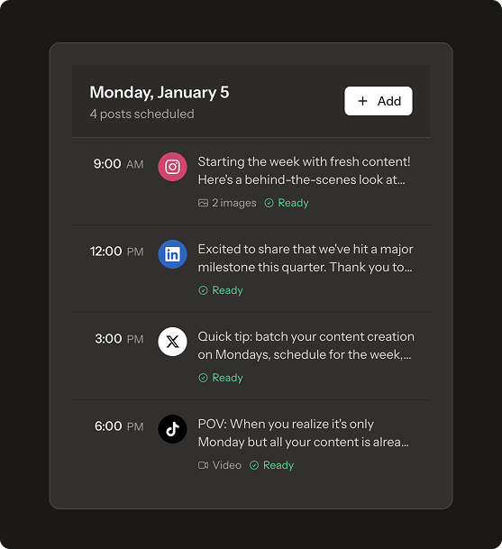 Posta supports Twitter/X, Instagram (Personal & Business), Facebook Pages, and LinkedIn (Personal & Company). We're adding TikTok, Pinterest, and more soon.